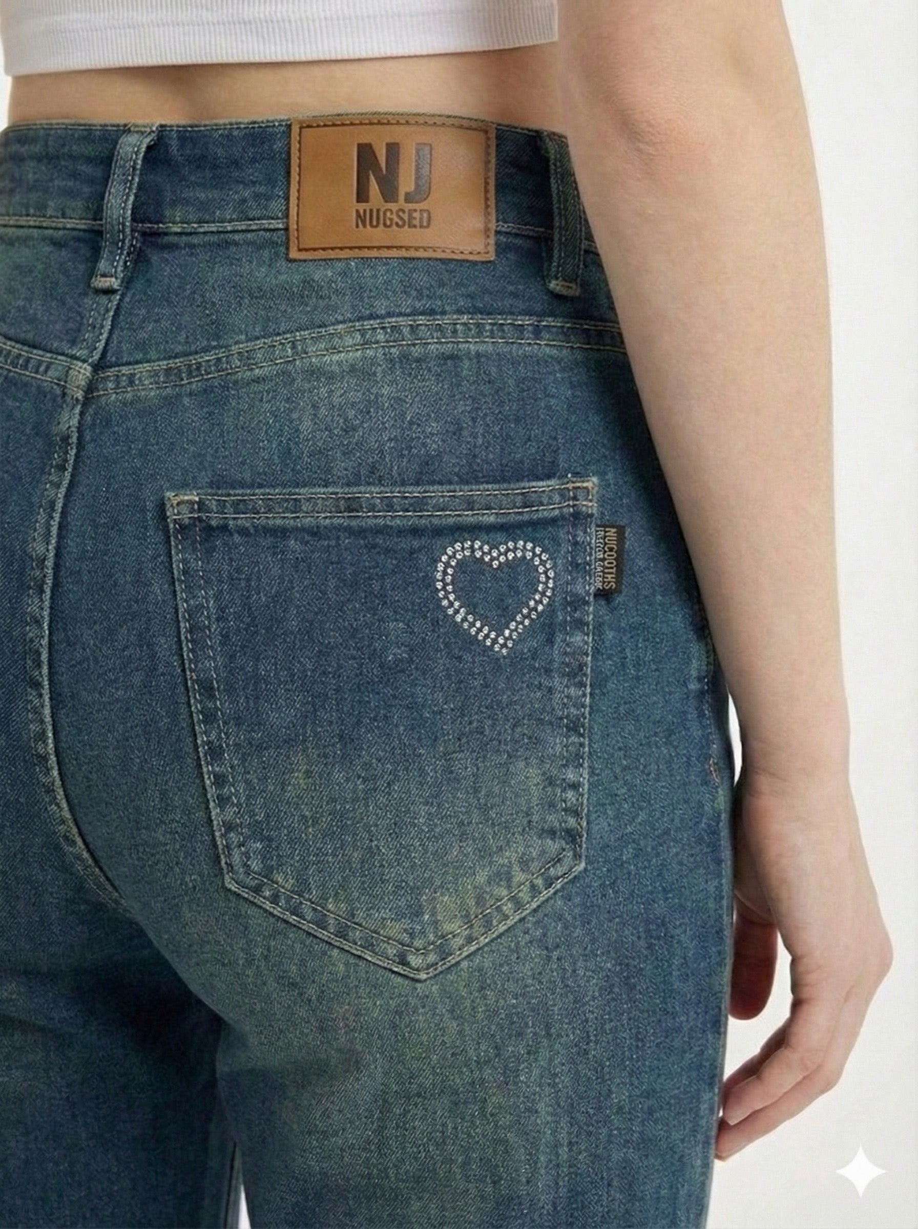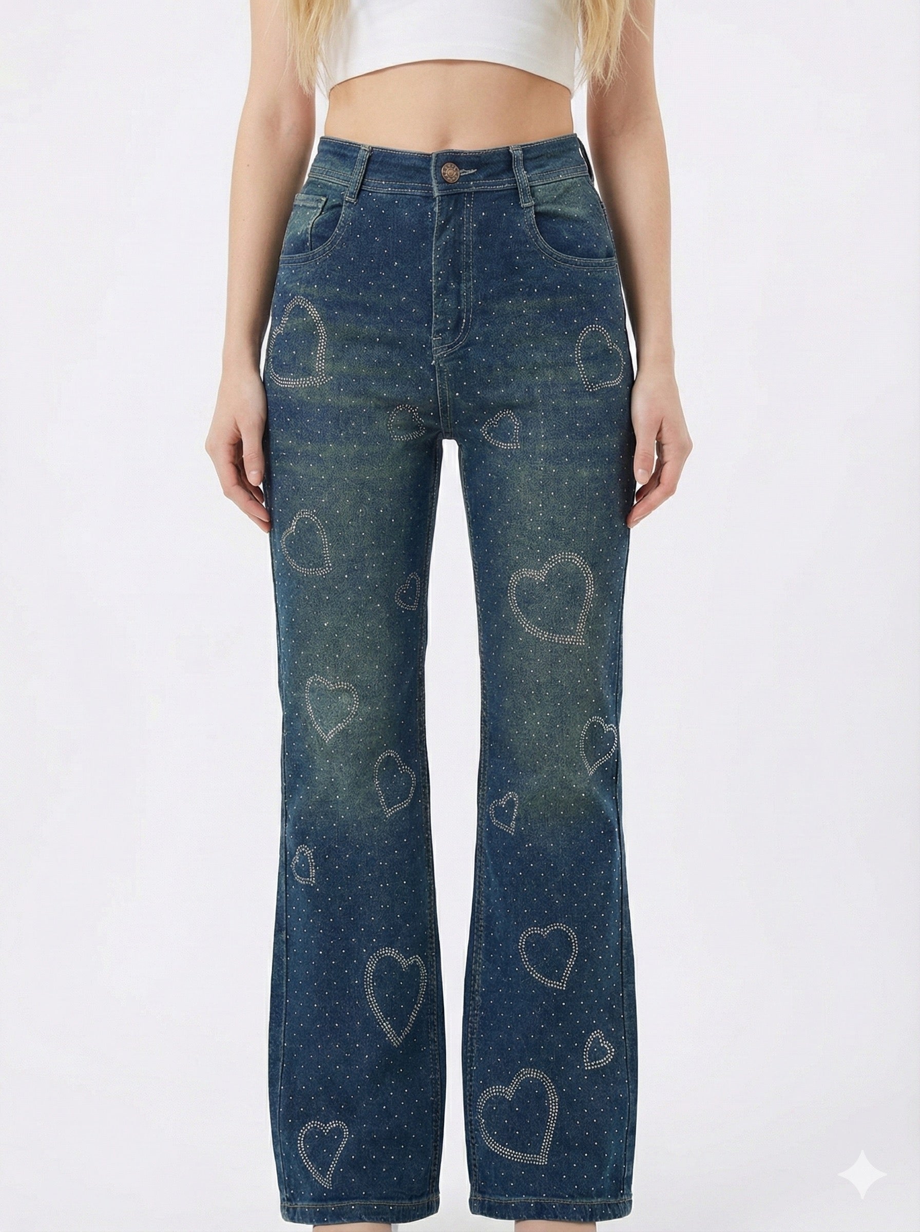 High-Waist Wide Leg Jeans with Rhinestone Hearts